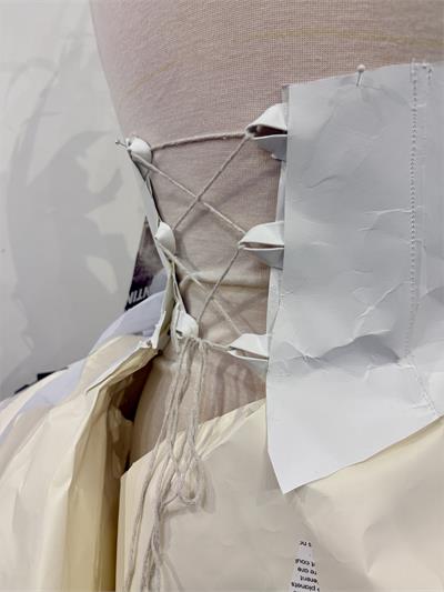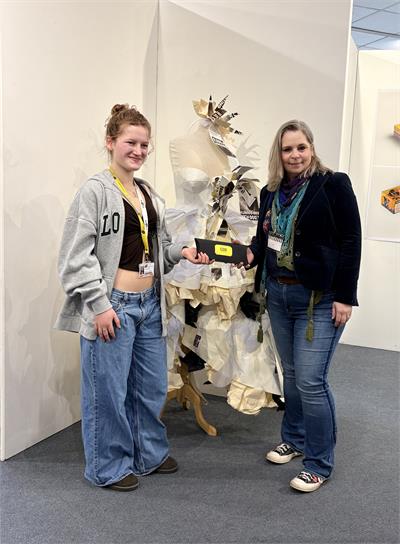 The winning entry was Ava Harrison’s striking Paper Dress, a visually powerful piece that demonstrates both technical skill and artistic vision. Ava used thicker Buckram embossed Lessebo Design Smooth White for the corset, carefully seaming each section and incorporating a clever laced back fastening. Printed textures, layered torn papers and crumpled sheets in cream, white and black were used to construct the skirt, creating movement, depth and drama. The muted colour palette brings cohesion and maximum visual impact to the piece.