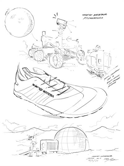 The installation unfolds as an immersive journey across two environments. The first space introduces visitors to a Mars inspired landscape, where surfaces, colours, and materials create an evocative, suspended atmosphere. The textures generated within this environment are translated onto the footwear, becoming a defining visual and conceptual element of the project. According to Pietro Franceschi, Sangi, and Francesco Saverio Matera: “As a research and development centre in the footwear sector, we approach this project as a territory of exploration - an opportunity to rethink every phase of the design process and push Kornit technologies beyond their conventional use, transforming them into tools for imagining new possibilities, both aesthetic and, above all, functional. Foot/Print EXP was conceived with the ambition of speaking to the entire industry, reaffirming the value of collaboration between brands and suppliers as a driver of innovation. It is precisely through this shared energy that it becomes possible to go beyond known boundaries - and, in our case, to symbolically push even beyond Earth’s atmosphere.”