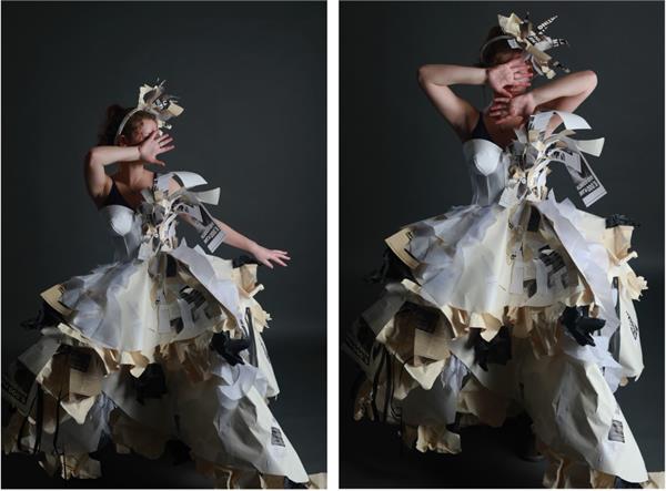 The winning entry was Ava Harrison’s striking Paper Dress, a visually powerful piece that demonstrates both technical skill and artistic vision. Ava used thicker Buckram embossed Lessebo Design Smooth White for the corset, carefully seaming each section and incorporating a clever laced back fastening. Printed textures, layered torn papers and crumpled sheets in cream, white and black were used to construct the skirt, creating movement, depth and drama. The muted colour palette brings cohesion and maximum visual impact to the piece.