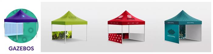 Gazebos Create A Branded Outdoor SpaceShade, shelter and a defined branded space.With full colour print and a range of sizes and configurations, a custom gazebo will amp up your customers brand come rain or shine at an outdoor event – literally! Chill in the shade or keep yourself dry regardless of what the weather throws at you. Even at an indoor expo, a gazebo will create a focal point and help define your space within a busy event.