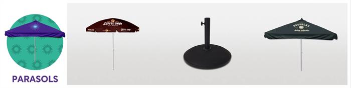 Parasols Keep Customers Covered And EngagedSunshine is a blessing, but when there’s too much of a good thing, printed parasols bring comfort to customers while they broadcast their brand. Solopress water resistant, fire retardant branded parasols have UV-resistant print that won’t fade in the sun. Choose between circular or square parasols in two epic sizes and keep them grounded with parasol bases.