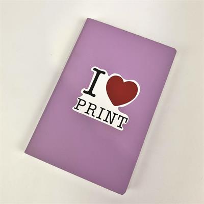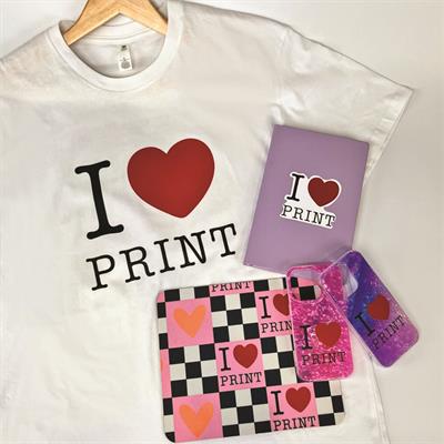 Using the I Love Print graphic as a single creative starting point, our emphasis was on showing how one design can translate seamlessly across multiple products that reflect today’s on-demand buying habits. We started by producing a shaped self-adhesive sticker on the Mimaki CJV200-75 solvent printer/cutter, applied here to a diary but equally suited to countless other surfaces. Stickers remain a powerful, low cost product with broad appeal, particularly in short run and personalised environments and can be as frivolous or practical in their design as required - from ‘I Love Print’ stickers to barcode product decals and safety warning labels.